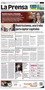 [email protected] Ladiscusiónsobresisede - bepagaronodietasalosfun - cionariosque formanparte de las juntas directivas de entidades públicasregresa a laAsambleaNacional. Una propuesta deley, que esperaserdiscutidaenlaCo - misióndePresupuesto–que presideelperredistaBenicio Robinson–estableceque los ministrosy viceministrosde Estado, diputados,directo - res, gerentes o jefes de insti - tuciones estatales, autóno - mas o semiautónomas, o cualquier servidor público queformepartedejuntasdi - rectivas, no devengaránsa - lario adicional, gasto de re - presentación,dietaoemolu - mento alguno por ejercer la funcióndemiembroodirec- tor de algunajunta directi - va. Esta iniciativa de ley, que impulsa el diputado pana- meñista Luis Ernesto Car - les,surgeluegodequeelpro - curador de la Administra - ción, Rigoberto González, advirtiera el año pasado que no existen normasjurídicas queregulenoestablezcanun techo al monto de la dieta que se le paga a cada miem- bro de las juntasdirectivas, por lo queel asunto quedaa discrecionalidaddecadaen- tidadestatal. VEA2A DonaVida logra mantener donaciones desangre PROGRAMA El programaDonaVida ha logradomantener establelas donaciones de sangre este año.Lascifrasindicanqueha recibido 7 mil 693 donantes, de los cuales, 5mil 131 com - pletaronladonación. VEA4A Hoy por hoy Elrecientecomunicadode laCámaradeComerciodes - cribeconpocaspalabras unarealidadquetieneal paíspostradoporcausadel crecientedesempleo,del aumentodelainseguridad ciudadanayuninexistente plandereactivacióneconó - mica,alqueseunenlasres- triccionesqueordenaelMi - nisteriodeSaludenmateria demovilidad,queincluyea losviajerosqueentranal país,concuarentenasobli - gatorias,enabiertaviola - ciónasusderechos,pesea quelascircunstanciashan variadoparabienconla campañadevacunación. Mientrastanto,elGobierno viveenunaburbujaenlaque nadiecontieneelgasto;enla quenohaydesempleonires - triccionesdejornadas;nadie veporelrestodelpaísynos endeudancomosinuestra economíaderramaradinero detantoqueproduce.Qué granlastreescargarsobre nuestroshombrosafuncio- nariosineptos,queusanel poderparaseguirhaciendo pedazoselpaíssiconello mantienensu statusquo ,sus bolsillosllenosycontentosa susseguidores.Debidoasu ceguera,lerecordamosque, siahoranohayunaexplo - siónsocial,nosignificaque noseacumuleiraciudada - na.Ycuandoestalle,yquie - ransaberquiéneselculpa - ble,mírensealespejo.Allí terminaránsuspesquisas. Panorama Cortizo recibió al canciller de Japón 2A Deportes Laautocrítica del capitán Harold Cummings 7A Vivir+ PanameñaAna K. Spalding promueve la ciencia inclusiva 6B Desinformación y falsedades sobre vacunas contra la Covid-19 Ivonne Torres Atencio, directora de Farmacología de la Facultad de Medicina de la Universidad de Panamá, desmiente con argumentos científicos por qué son falsos los planteamientos contra las vacunas anticovid que circulan en redes. VEA 4A Apertura de cuentas Sector bancario Representantes de la industria bancaria y del regulador señalaronque están trabajando para mejorar la experiencia en los procesos de vincula- ciónde clientes, haciendo unmayor uso de herra- mientas digitales,mien- tras se respetan lasmedi- das de prevención. æ Rechazanacuerdos con empresas cuestionadas GIRAPRESIDENCIAL Sectoresde lasociedadci - vil cuestionan la gestión de inversionesextranjeraspara elpaíssisehacenconempre- sas cuestionadas y sin un planeconómico delGobier - nodebidamenteelaboradoy comunicadoalpaís. Lascríticasrecaenenlagi - rade trabajoquehizo elpre - sidente LaurentinoCortizo a Estados Unidos, que cul - minóelviernespasado. El mandatario, que salió en busca demás inversión extranjera, avaló un memo - randode entendimiento en- trela SecretaríaNacionalde Energíade Panamáy laem - presa Energy Transfer para estudiar la viabilidad dela participación conjunta en un proyecto de Oleoducto Trans-PanamaGateway. VEA3A RickStopfer, de laCámara deComercioHispana de Irving, Texas, y el presidenteCortizo. CortesíaPresidenciadelaRepública Comunidadexigecerteza en investigaciónminera ACCIDENTE ENCOLÓN Comunidades próximasa la explotación de cobre en la provinciade Colón, a cargo deMinera Panamá, están en alerta por el derrame de una sustancia procedentede la mina, y exigen conocer los riesgosalasaludyalambien- te, yaque adviertenquees la terceravequeocurre. Personal delMinisterio de Salud irámañana, martes, al lugardondese rompióla tu - bería del proceso extractivo, mientras que funcionarios del Ministerio de Ambiente investigan insitu desdeelpa- sadoviernes. VEA3A COVID-19 Datos hasta el 18.07.2021 ESTADÍSTICAS EN PANAMÁ 721 Casos positivos nuevos 422,678 Casos totales 6,703 Fallecidos en total 6 Fallecidos en el día Infografía: LP - Fuente: Minsa 9,322 Pruebas aplicadas en el día 610 Hospitalizados en sala 131 Hospitalizados en UCI 7.7% Positividad de las pruebas
