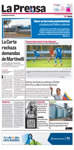1A La Prensa Panamá, sábado 11 de octubre de 2025 El medio libre de Panamá 75¢ Sábado 11 de octubre de 2025 - Año 45 - Nº 15166 Hoy por hoy En el transcurso de 24 horas ocurrieron dos hechos que aparentan diferencias, pero tienen coincidencias. Se trata de la destitución de Dina Boluarte como presidenta del Perú y la elección de María Corina Machado como Nobel de la Paz 2025. Lo primero parece haber discurrido conforme a los cánones constitucionales, lo que indica que en ese evento prevalecieron las reglas democráticas. Lo segundo representa el reconocimiento del mundo de que Venezuela reclama la democracia. Por la ausencia de democracia y, con ello, de libertades en dicho país, María Corina Machado ha librado una batalla pacífica, inteligente y efectiva, al punto de que no hay forma de justificar que el régimen dictatorial siga en pie. La actuación de Machado representa la reivindicación popular de la democracia como opción de gobierno; nada puede excusar, en términos absolutos, que se abandone la democracia. Por ello, no importa la ideología del gobierno de turno, la democracia tiene que ser la única opción. Ambos sucesos, si bien diferentes, coinciden en la preponderancia del respeto a la democracia, así como a las libertades y, con ello, a la dignidad de la persona humana. Cinco provincias tendrían plantas agroindustrales 1B Economía Panorama Reporte revela percepción de restricción a la libertad de expresión 2A ADEMÁS Demandan la ley que blinda los nombramientos políticos en la AN 2A La Corte rechaza demandas de Martinelli Juan Manuel Díaz [email protected] NEW BUSINESS Las demandas del expresidente fueron denegadas con una mayoría de 7 votos a favor y 2 salvamentos. El pleno de la Corte Suprema de Justicia (CSJ) rechazó, con una votación de 7 a favor y 2 salvamentos, dos demandas de inconstitucionalidad presentadas por el expresidente Ricardo Martinelli contra la orden de indagatoria y la condena a 128 meses de prisión por blanqueo de capitales en el caso New Business. Los magistrados María Eugenia López Arias, Maribel Cornejo, Ariadne García, Carlos Vásquez, María Cristina Chen Stanziola, Olmedo Arrocha y Miriam Cheng Rosas votaron en contra de las demandas, mientras que Ángela Russo y Cecilio Cedalise presentaron salvamentos de voto. La decisión deberá ser firmada por todos los magistrados, y aún se desconoce cuándo se podrá acceder al contenido completo del fallo. Las demandas de Martinelli buscaban anular la orden de indagatoria y la sentencia emitida por la juez Baloisa Marquínez, alegando violaciones al principio de especialidad del tratado de extradición entre Panamá y Estados Unidos. Sin embargo, tanto el procurador de la Nación como instancias judiciales previas han confirmado que la sentencia está debidamente ejecutoriada. VEA 3A El Nobel de la Paz 2025 fue otorgado a la opositora venezolana María Corina Machado por su “incansable labor en la promoción de los derechos democráticos del pueblo de Venezuela”, generando felicitaciones de líderes políticos en América Latina y el Caribe, como José Raúl Mulino, Gustavo Petro, Juan Manuel Santos, Iván Duque, Álvaro Uribe, Javier Milei y Daniel Noboa, quienes destacaron su valentía y lucha por la democracia. La coalición opositora venezolana PUD celebró el galardón como un impulso a la libertad y justicia en el país. VEA 5B Idaan no hará más mantenimiento a la planta de Chilibre, este año Durante lo que resta de 2025, la planta potabilizadora de Chilibre no tendrá más paros programados, anunció el Idaan. La entidad garantiza un suministro estable de agua potable a 1.5 millones de habitantes de Panamá y San Miguelito. 4A Panamá celebra triunfo 1-0 sobre El Salvador Eliminatorias de la Concacaf rumbo al Mundial 2026 La selección nacional de fútbol de Panamá se impuso anoche a El Salvador en el estadio Cuscatlán en San Salvador, logrando su primera victoria en esta ronda final de las eliminatorias de la Concacaf rumbo al Mundial de 2026. El gol vino en el minuto 55 cuando Michael Amir Murillo apareció por la banda derecha y asistió a José Fajardo para la anotación de la selección panameña. Es la primera victoria en siete oportunidades por eliminatorias. El triunfo permite a los dirigidos por Thomas Christiansen afianzarse en la cima del Grupo A, igualando en puntos a Surinam, su próximo rival, tras el empate ayer más temprano entre Surinam y Guatemala en Paramaribo. Vea más en prensa.com Anel Asprilla/enviado especial - - y el Caribe, como José Raúl Mulino, Gustavo Petro, Juan Ma Líderes de América celebran el Nobel de la Paz a a María Corina Machado